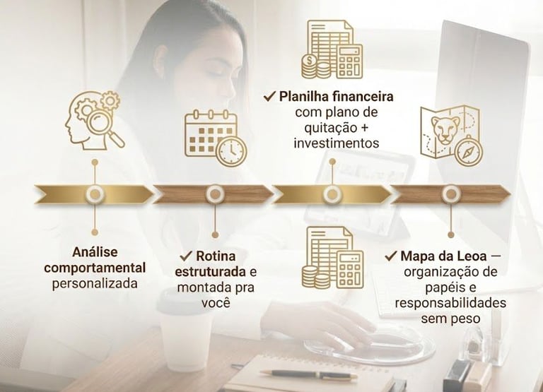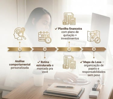 quitação de dívidas, organização mensal, planilha de investimentos e uma estratégia de reserva que finalmente te coloca no controle do seu dinheiro.